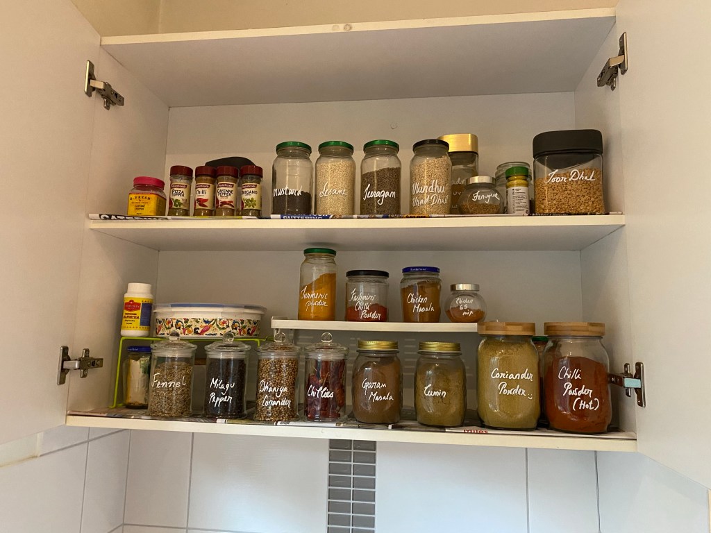 This time, I was motivated to organise the kitchen shelf and made it a point I somehow do it. First went on to buy a few items not overly expensive for storage; like small baskets, spice jars and a white marker pen for labelling.