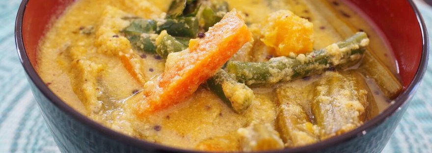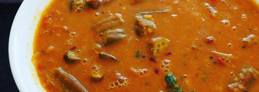 Mor Kuzhambu is a delicious yogurt based curry which is very popular in South India in the state of Tamil Nadu. The style shown here is the traditional Iyengar style. The vegetarian dishes made by the Brahmins are quite unique and very tasty. This Mor kozhambu is one of the popular dishes which fall under that category.In this recipe, I have used ladiesfinger (okra) vegetable. We can also use taro(seppankizhangu), pumpkin, chow chow instead of vendakkai (okra). It goes great with steamed rice.